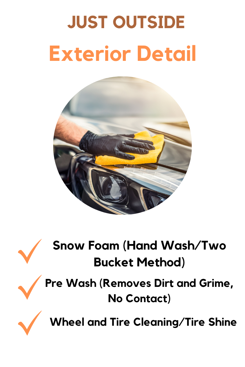 Revitalize your vehicle's exterior with our premium Exterior Detail service. We begin with a professional hand wash and meticulous clay bar treatment, ensuring a thorough cleanse. Say goodbye to pesky bugs and tar as we restore your vehicle's shine with detailed rim faces and tire dressing. We don't stop there - our experts meticulously dress all exterior plastics and clean wheel wells for a flawless finish. Even minor sap removal is no match for our attention to detail. Plus, our Ceramic Spray Coating provides three months of protection, sealing the deal with a lasting wax finish. For the finishing touch, we offer spot polish touch-ups, ensuring your vehicle looks its absolute best from every angle. Trust us to elevate your ride with our expert exterior detailing services.