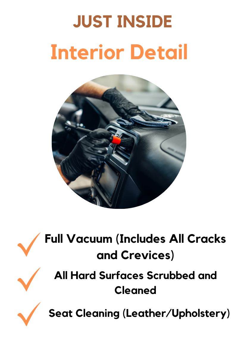 Transform your vehicle's interior into a sanctuary of cleanliness and comfort with our Interior Detail service. We leave no surface untouched, beginning with a thorough full wipe-down and double vacuuming to rid your interior of dust and debris. Crystal-clear windows and protected plastics ensure a pristine look that lasts. Our upholstery cleaning and extraction process restores freshness to your seats and carpets, while our luxurious leather treatment keeps your interior feeling sumptuous. We even tackle minor pet hair and carpet stains with precision, detailing floor mats and the trunk for a comprehensive clean. Finally, indulge your senses with our air freshener treatment, leaving your vehicle smelling as good as it looks. Trust us to provide the ultimate interior detailing experience, ensuring every drive is a delight.